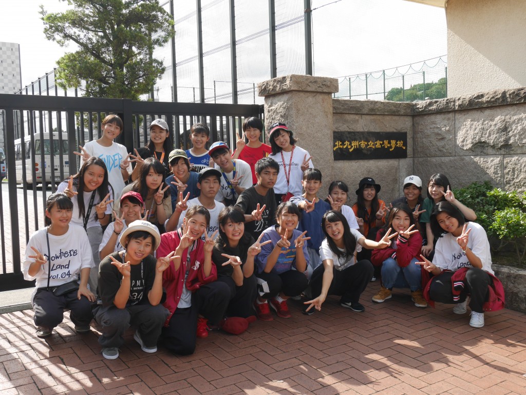 北九州遠征、チームダンス選手権大会の翌日、北九州市立高校にお邪魔させていただきました。台風一過の快晴の中、三重高校、鹿児島城西高校、東海学園高校、そして一条とあわせて五校による合同練習会となりました。