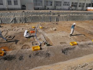 人文科学科1年生、土師器や須恵器や瓦や炭などが出土している。かなり大きな邸宅があった様子です。